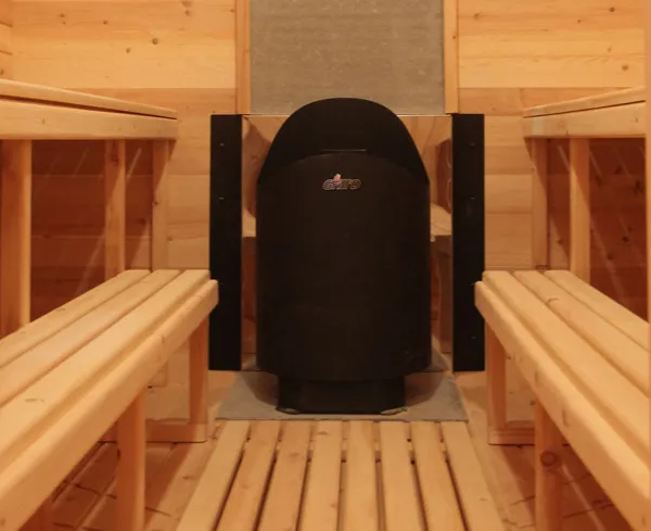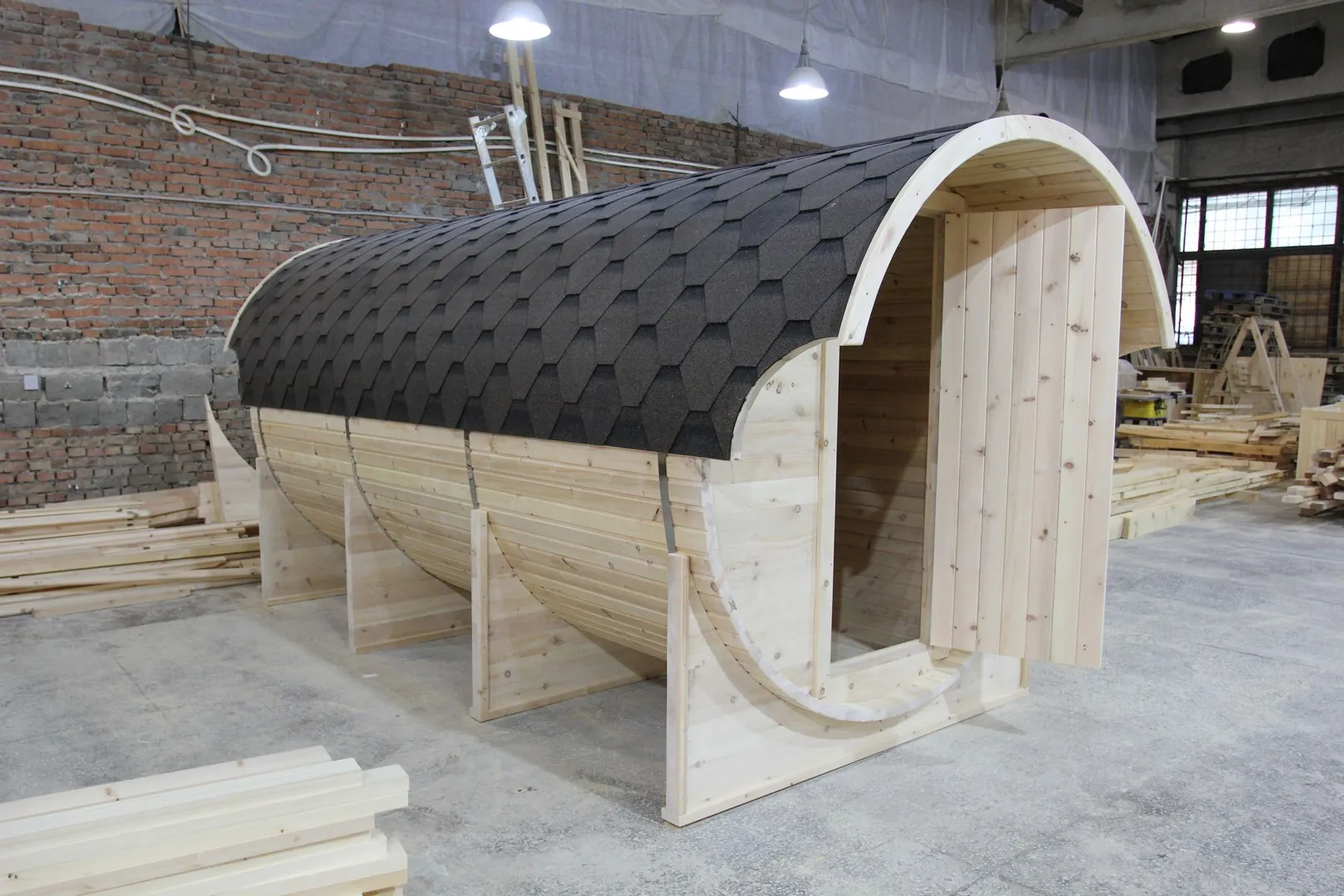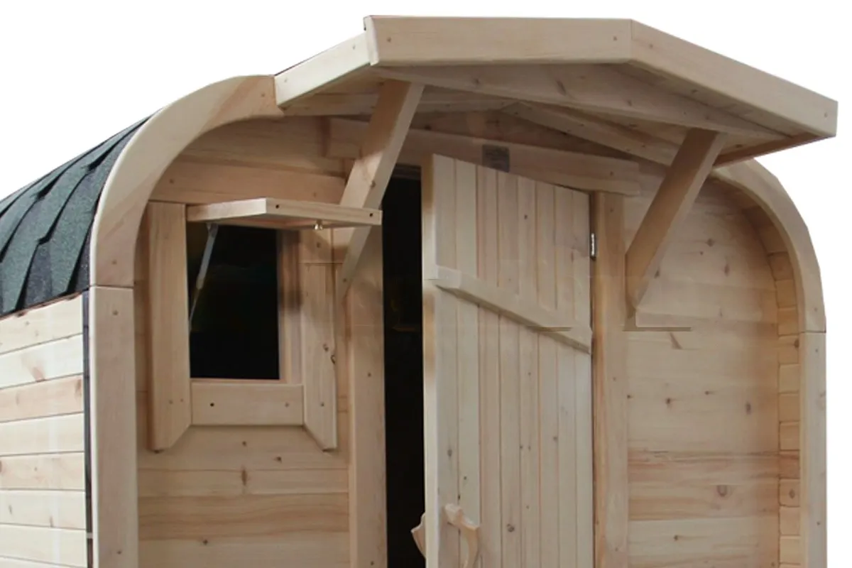 Главной отличительной особенностью данной бани «Буханка» является полная обшивка гибкой черепицей всей внешней части бани, а так же наличие крытой входной группы. Включает в себя небольшую веранду, раздевалку, которая служит комнатой отдыха, моечную и парильное отделение. Для удобства пользования в раздевалке находятся лавочки и вешалка из кедра. Моечная оборудована душевым поддоном, полочкой и лавочкой. В парильном отделении по обе стороны расположены двухуровневые открытые полки, печь установлена между ними у дальней стены. Время растопки такой бани не превышает 30 минут. По вашему желанию баню-бочку можно укомплектовать козырьком, верандой и печью с внешней загрузкой, благодаря которой весь мусор после топки остается на улице. Баня-бочка буханка не требует полноценный фундамент, поэтому при необходимости ее можно перенести в другое место.