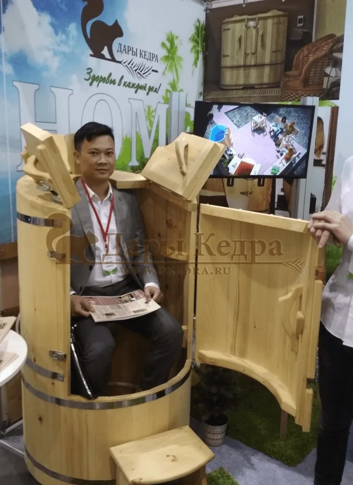 Двухместная фитобочка из кедра - это парная, в которой удобно принимать процедуры двум людям. Она оборудована откидными створками, дверцей, отверстием для головы и перегородкой (по желанию). Толщина стенок составляет 25 мм. Во время парения человек находится внутри кедровой бочки, а голова снаружи. Благодаря этому исключается возможность перегрева. Подлокотники из кедра и внутренние ручки делают эксплуатацию фитобочки более удобной.
