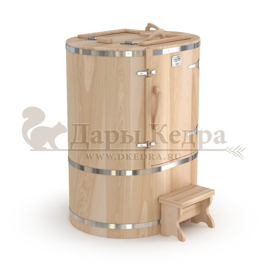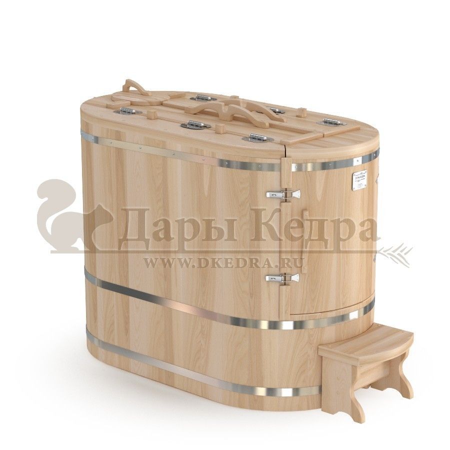 Кедровая бочка (фитобочка) овальная со встроенным парогенератором «Профессиональная» Овальная форма этой кедровой бочки позволяет комфортно разместится даже высоким людям. Встроенный парогенератор исключает дополнительный монтаж. Ширина 78 мм позволяет занести бочку в помещение со стандартным проёмом в собранном виде. Толщина стенок 45 мм позволяет увеличить срок службы изделия. Подходит для коммерческого использования.