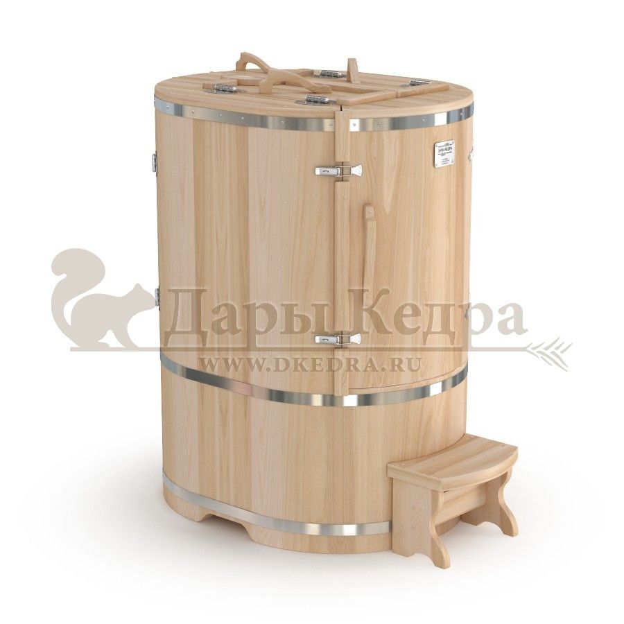 Кедровая бочка (фитобочка) овальная «Профессиональная» Овальная фитобочка из кедра - это мини парная, которую можно использовать не только в спа-салонах, но и дома. Овальная модель более просторна и удобна в использовании. Толщина стенок составляет 40-45 мм, что позволяет увеличить срок службы изделия. Она оборудована откидными створками, дверцей и отверстием для головы. Во время парения человек сидит внутри кедровой бочки, а голова находится снаружи. Благодаря этому исключается возможность перегрева. Подлокотники из кедра, встроенные ручки на створках и двери делают эксплуатацию более удобной. Парение в фитобочке благотворно влияет на организм в целом: повышается иммунитет, выводятся шлаки и токсины, улучшается работа органов тела и состояние кожи.